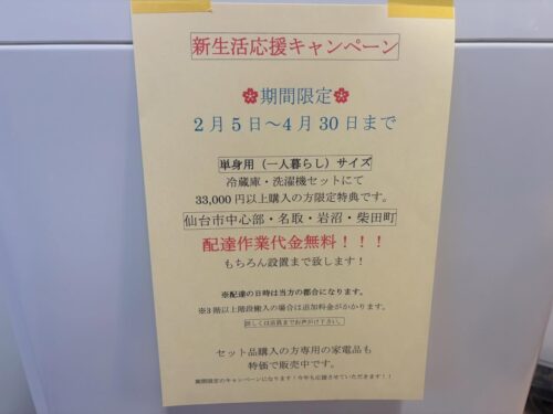 そして、無料で配達します!仙台市中心部→岩沼あたりにお引越し予定の方、村田の店舗付近にお引越し予定の方、2階のお部屋まで無料で配達します。学生の方・新社会人の方を応援するキャンペーンになりますので、その他の方・その他の品をご購入の方はごめんなさい!