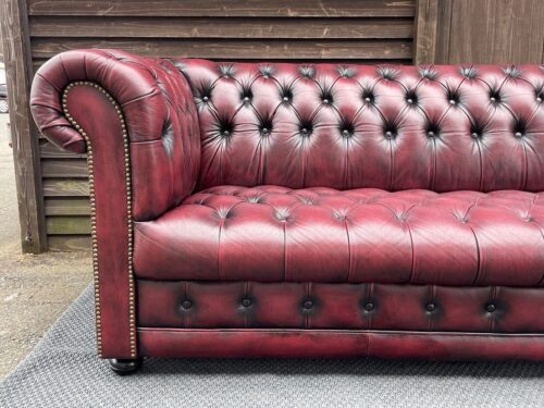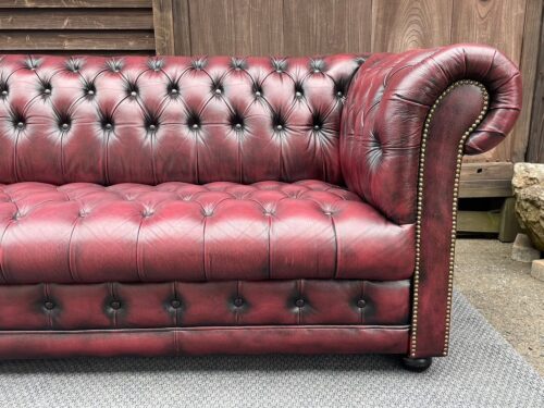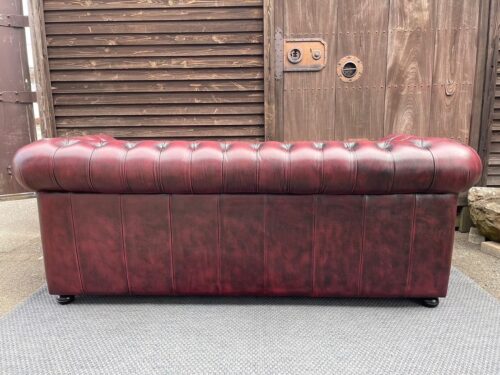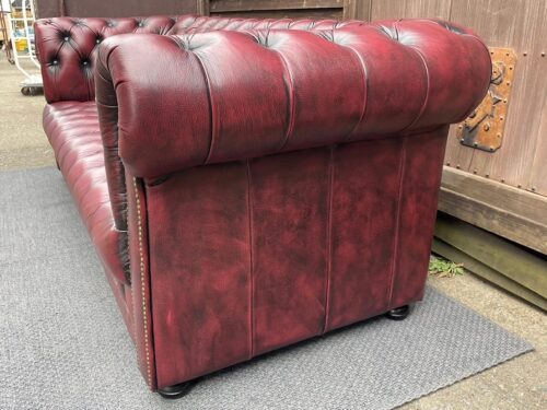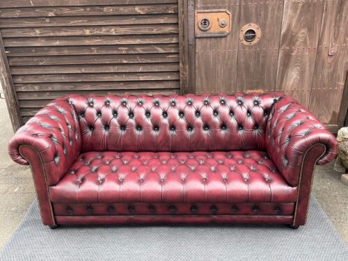 チェスターフィールドの本革3人掛けソファー入荷!もうすでに店内で目に留まった方も多くいらっしゃると思います。この存在感!幅は205センチです。全面は本革・両サイドと背面は合皮と思われます。気になる方はぜひ見に来てくださいね。