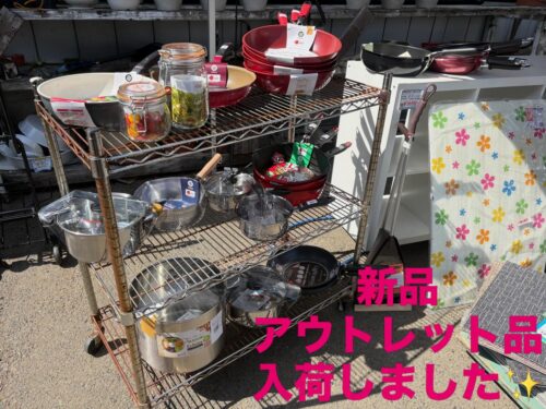 新品アウトレット品が入荷しました!鍋やフライパンなど、新生活に役立つアイテムが揃っています。新品ですが、傷・凹み・歪み・パッケージ破損などがある商品です。連休中はさらに入荷予定ですので、ぜひご来店ください!お花も増えており、店内が一気に春らしくなっています!